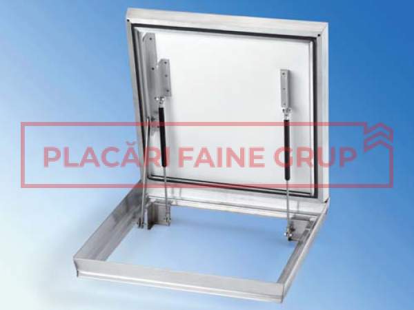 - Proprietăţi: capac de cămin modern, uşor, cu confort maxim la deschidere. Reducere substanţială a greutăţii în comparaţie cu capacele de cămin cu umplutură de beton. Confort optim de deschidere datorită arcurilor cu gaz. Cu dispozitiv de protecţie la cădere. Montarea se realizează mai rapid şi mai simplu, deoarece este eliminată umplerea vanei cu beton. Pentru acoperirea cu plăci, gresie, parchet, etc. stă la dispoziţie o înălţime liberă de mm. Pentru gresia subţire, compensarea înălţimii se realizează cu un adeziv de gresie adecvat (MAPEI Keralastic) şi cu plăci de construcţie impermeabile. Model etanş la aer şi, în mare măsură, la apă, cu o calitate foarte ridicată a prelucrării. Suprafaţă foarte frumoasă, mai ales a marginilor vizibile. Colţarele cu aspect discret simblifică prinderea gresiei şi a altor plăci.
